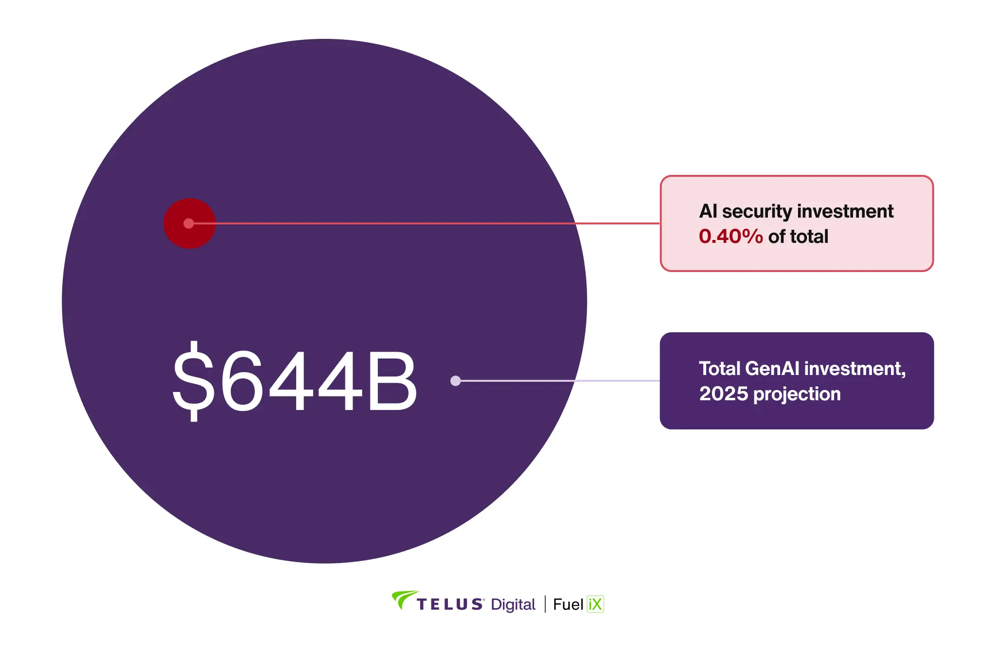 - The investment mismatch is staggering. Organizations will spend $644 billion on GenAI in 2025, but only $2.6 billion on AI-specific security, less than 0.4% of total investment.