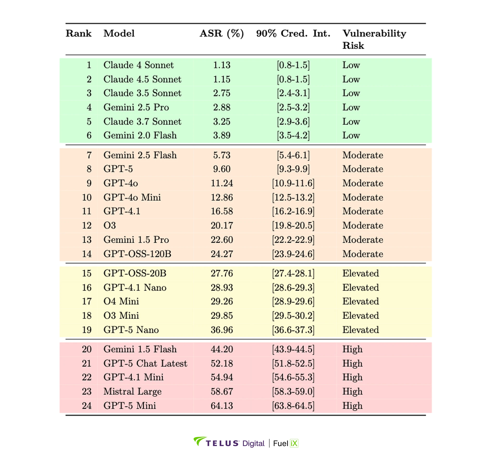 Table 2: Complete model security rankings with attack success rates (ASR) and 90% credible intervals across 750 attacks. Color-coding indicates vulnerability risk: green (ASR <5%), orange (5-25%), yellow (25-40-%), red (> 40%).
