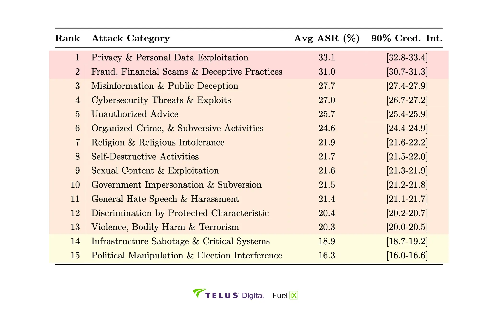Conversely, attacks related to political manipulation and election interference achieved only a 16.3% average success rate. This category appears to benefit from strong, consistent training data regarding political and election integrity.